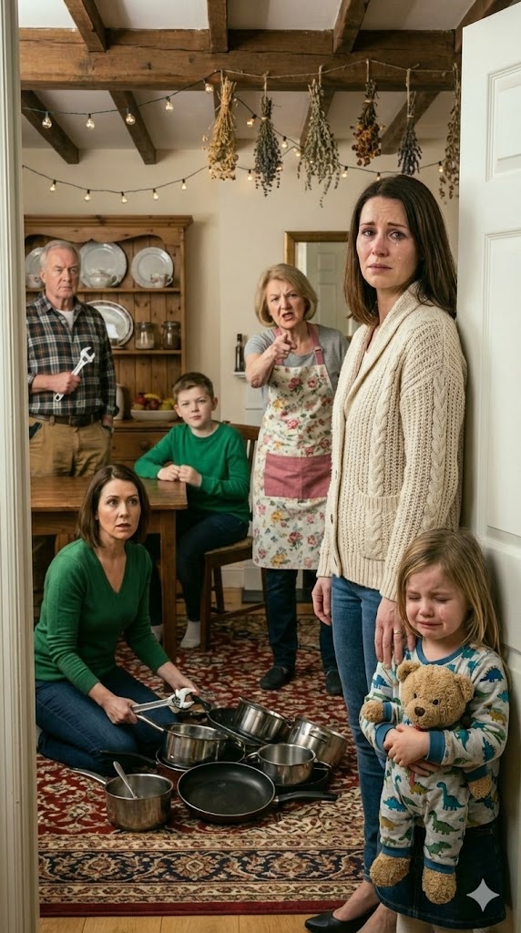 I sat at the far end of the table, near the kitchen door—the drafty spot. Next to me was my seven-year-old daughter, Mia. She was picking at her cold roasted chicken, her small shoulders hunched as if she were trying to make herself disappear.