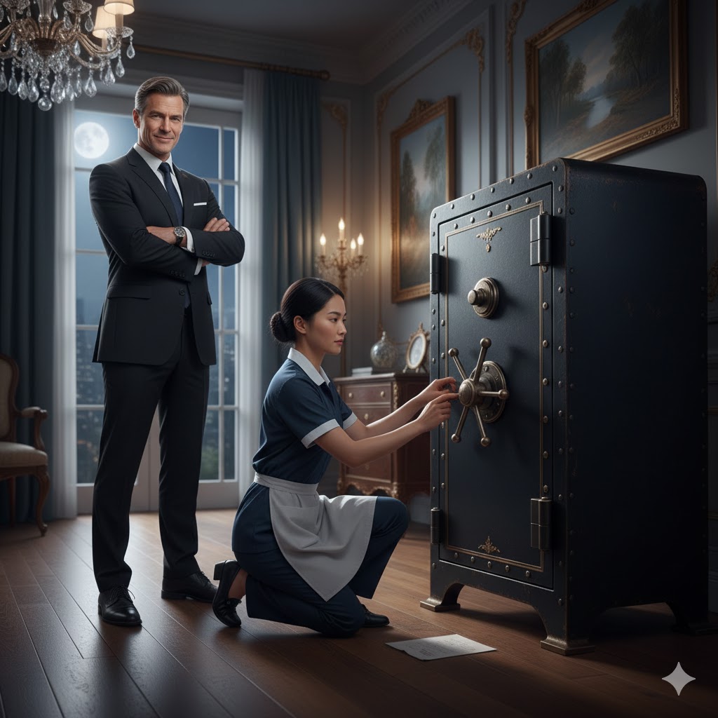 Then, his eyes returned to the safe. He walked over to it, not as a janitor, but as something else entirely. He knelt, his posture changing, his focus sharpening. He didn’t touch the dial; he didn’t try the handle. He simply placed the palm of his hand flat against the cold steel of the door, closed his eyes, and listened.