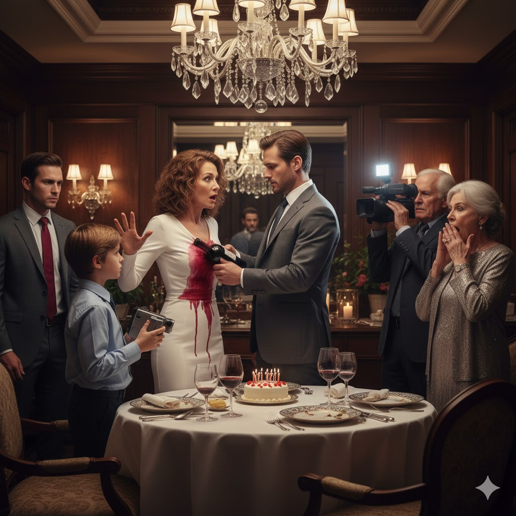 When the waiter poured the first round of drinks, Mark grabbed the bottle of red wine and insisted on doing the pouring himself. I thought it was just him showing off. But when he reached my side, he tipped the entire bottle forward—slowly, deliberately—and crimson wine cascaded down my dress, soaking the fabric, dripping onto the floor.