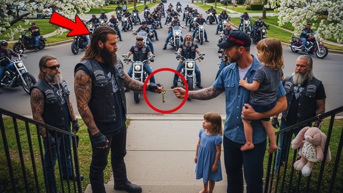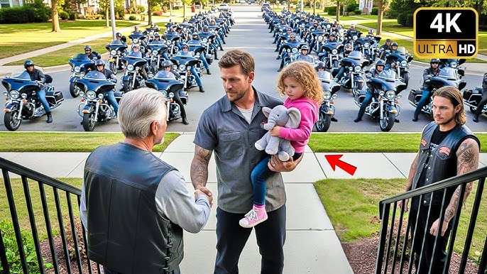 That night, while Lily slept under her glow-in-the-dark ceiling stars, Adam stared at the stack of unopened bills on the table. He didn’t cry, but he came close. Then, faint at first, he heard it—the distant rumble of motorcycles. It grew louder, a chorus of engines weaving into the night. Adam walked to the window, confused, and saw headlights lining up one after another. By dawn, more than forty motorcycles lined the curb outside Adam’s small rented home. Chrome glinted under the morning sun. Jackets bore insignias unfamiliar to most, but instantly recognizable to those who knew the streets. Adam stood in the doorway, shielding Lily behind him. His hands trembled, not from fear but from uncertainty.