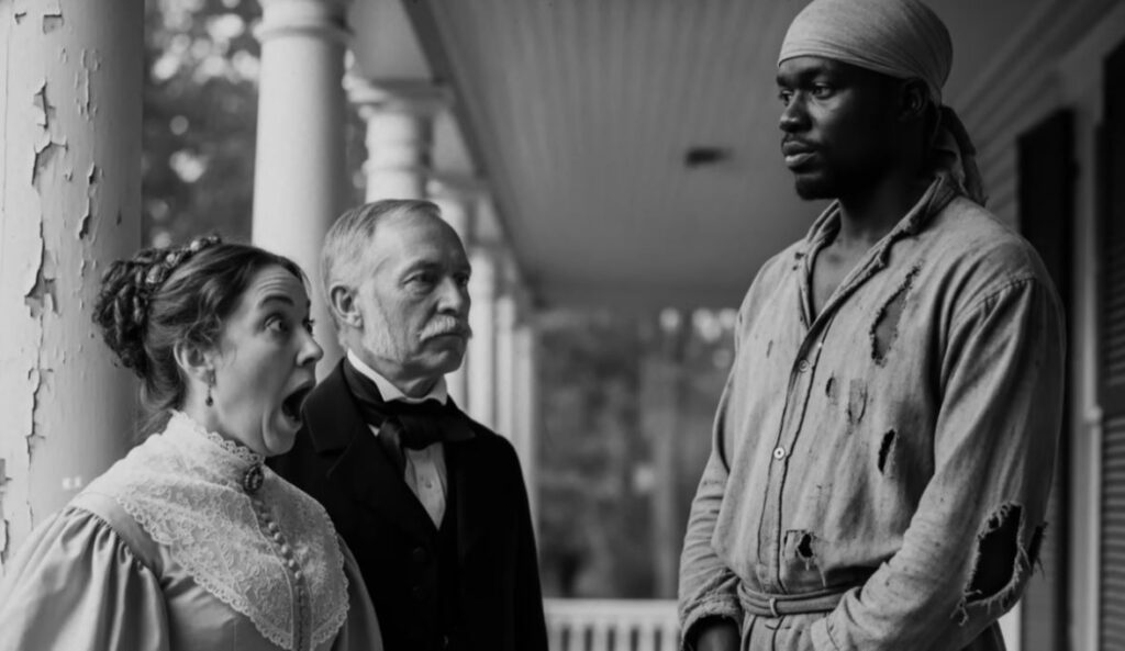 Catherine Marlo stood on the sun-baked veranda of Oakidge Plantation, fanning herself against the heavy August air. The world was quiet except for the distant rumble of wagon wheels grinding up the long dirt road. Her husband, Richard, sat beside the driver, gesturing with the wide, self-satisfied movements of a man who believed he’d made a clever bargain. But it wasn’t Richard’s excitement that made Catherine’s breath catch—it was the figure chained in the wagon’s rear.